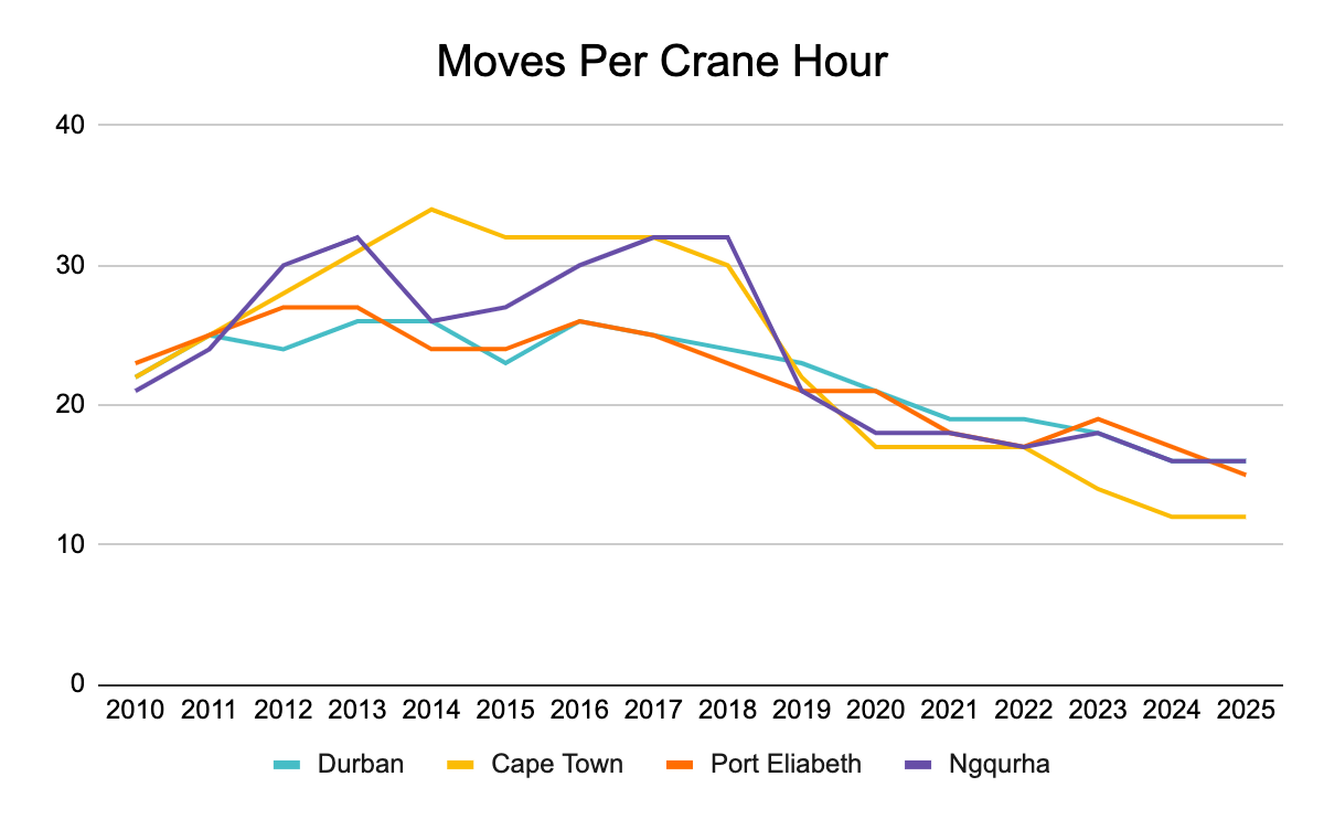 Using Moves Per Crane Hour as an efficiency gauge, we see in the chart below that efficiency at all major ports in South Africa has fallen off a cliff since 2016 to 2018, and has continued to trend downwards.