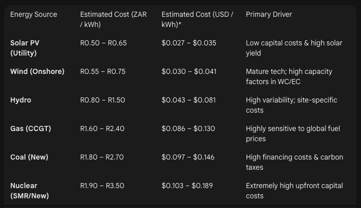 I also asked Gemini to table a current estimated cost per kWh for solar energy vs other forms of energy in South Africa, see below…
