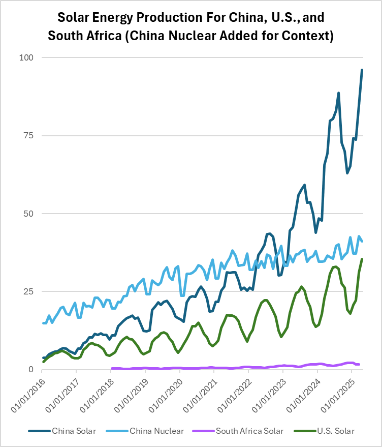 Growth in solar energy capacity in South Africa is virtually non-existent when compared to the U.S. and China (obviously because these economies are orders of magnitude larger, and are more productive). See the chart below comparing solar energy production for South Africa vs China and the United States.