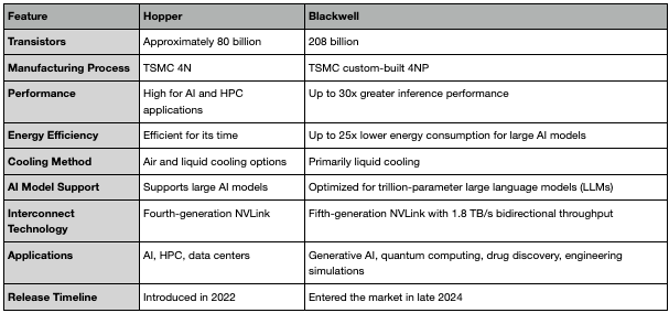 For starters, NVIDIA has an approximately 90% market share of AI-specific GPUs and AI architecture. This dominance is driven by their superior products built specifically for AI workloads. You may have heard people talk about H100 and H200 GPUs, as well as the related networking infrastructure that allows companies to build supercomputers for AI training–well that's NVIDIA’s Hopper platform for AI. In late 2024 however, NVIDIA officially released a new platform called Blackwell which offers 30 times greater performance, at an energy consumption that's 25 times lower than Hopper. I asked Perplexity to create a table that shows a comparison between NVIDIA’s Hopper and Blackwell platforms: