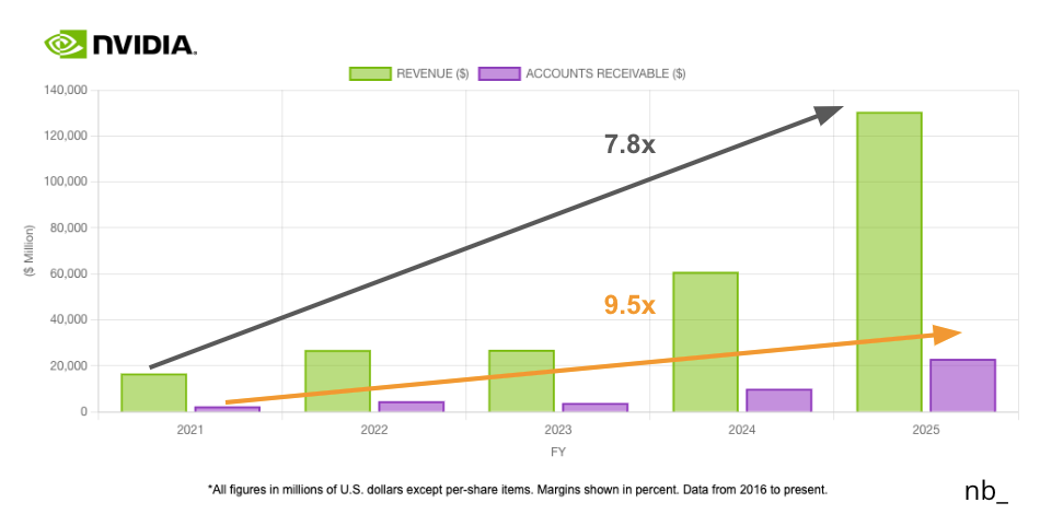 Last week, while looking at NVIDIA’s financials as well as listening to industry experts on NVIDIA and NVIDIA’s position in the AI space, I was made aware that NVIDIA’s accounts receivable has grown from $2.3 billion in 2021 to $26 billion in 2024. That's a 9.5x increase. In the same period, NVIDIA’s revenues went up 7.8x to $130 billion in FY 2025.