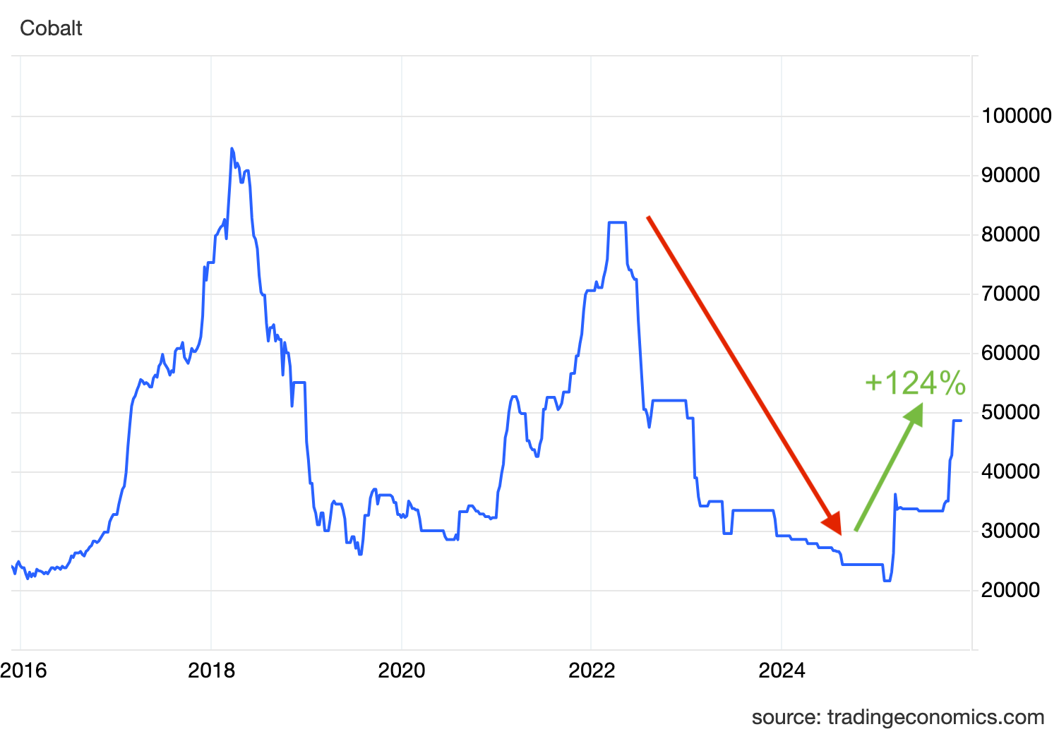 Facing a 2024 oversupply glut that drove prices from over $80 000 a ton to near 10-year lows at around $21 000 a ton, the DRC imposed an export ban on cobalt starting in February this year – initially 4 months, and ended up extending the export ban twice to ~8 months total.