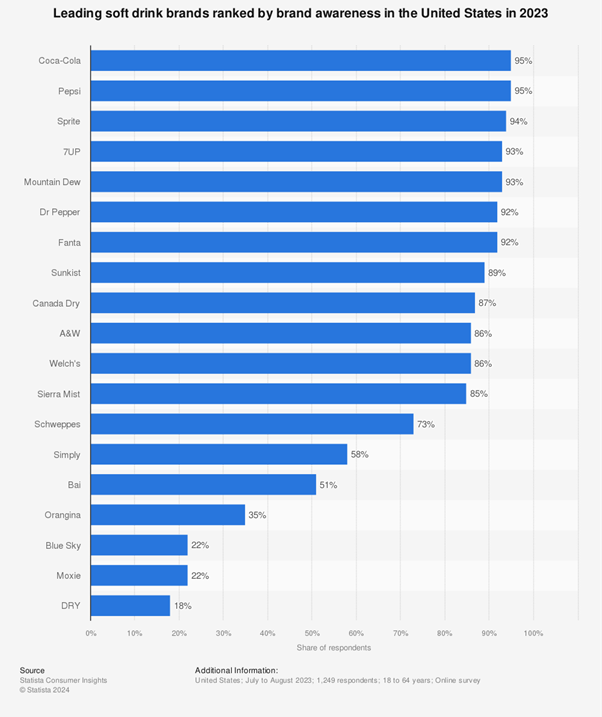 According to Statista, in 2023 Coca Cola and Pepsi were tied for being the 2 soft drink brands with the highest brand awareness in the United States, recognised by 95% of survey respondents.