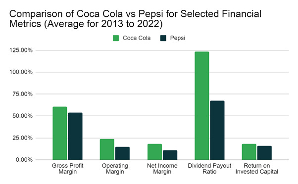 Noting that Pepsi has averaged $69 billion in global revenue from 2013 to 2022, vs Coca Cola’s $40 billion - from an investor’s perspective, Coca Cola generates more stable cash flows which afford the company the ability to pay a consistently high dividend to shareholders.