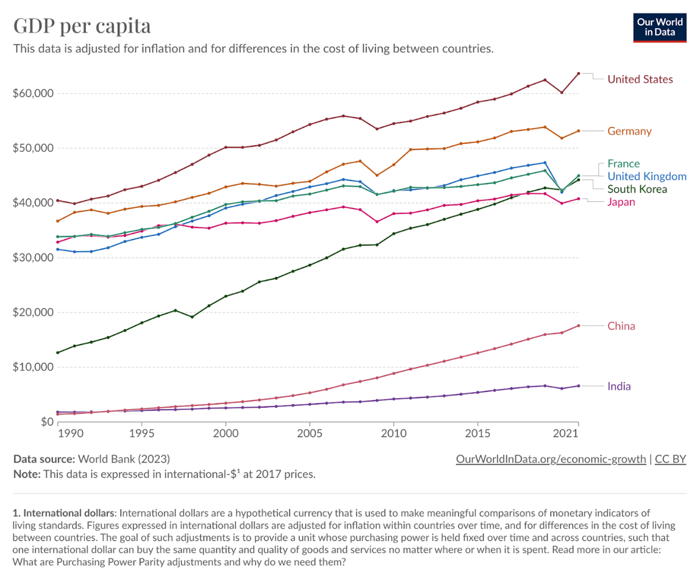 On the first note, Buffet has mentioned that he will always bank on American companies and the American economy. We can look at GDP per capita comparisons to see why.